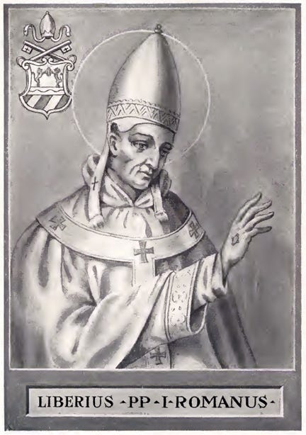 In fairness, Liberius was under duress when he apparently signed the text — he had been kidnapped and exiled by the Arian emperor Constantius II, who wanted him to accept Arianism, and to excommunicate Athanasius.
