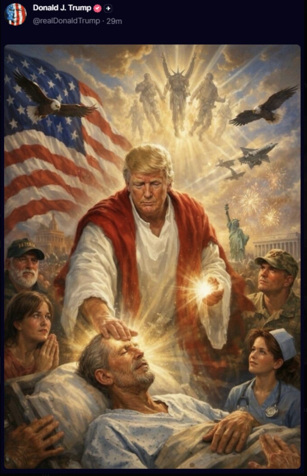 The picture struck most people, including me, as a Trumpish bit of blasphemy, in which POTUS shared some AI-created and trippy Trump/Christ mashup featuring a bald eagle, a Statue of Liberty/King Triton/St. Michael hybrid, and a couple of F-35s just for good measure.