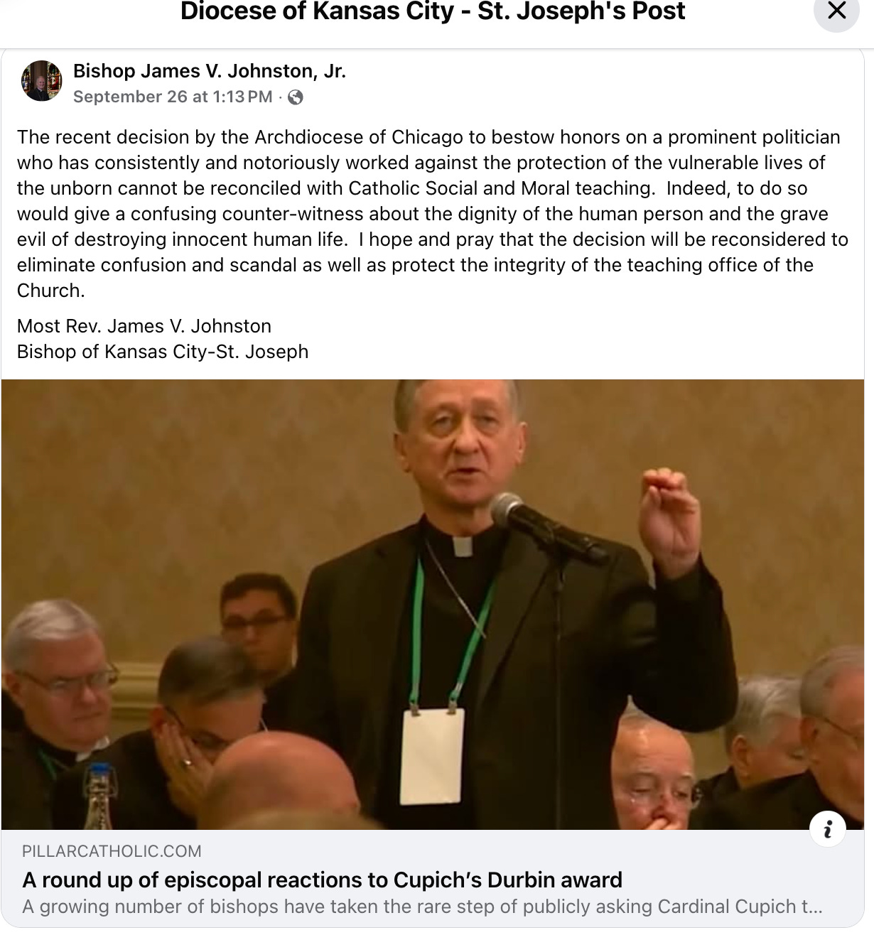 "Chicago’s Cardinal Blase Cupich fired back — saying in a statement that the award was focused only on Durbin’s immigration work, and that it was meant to open a “dialogue” with Durbin, as bishops are supposed to do."