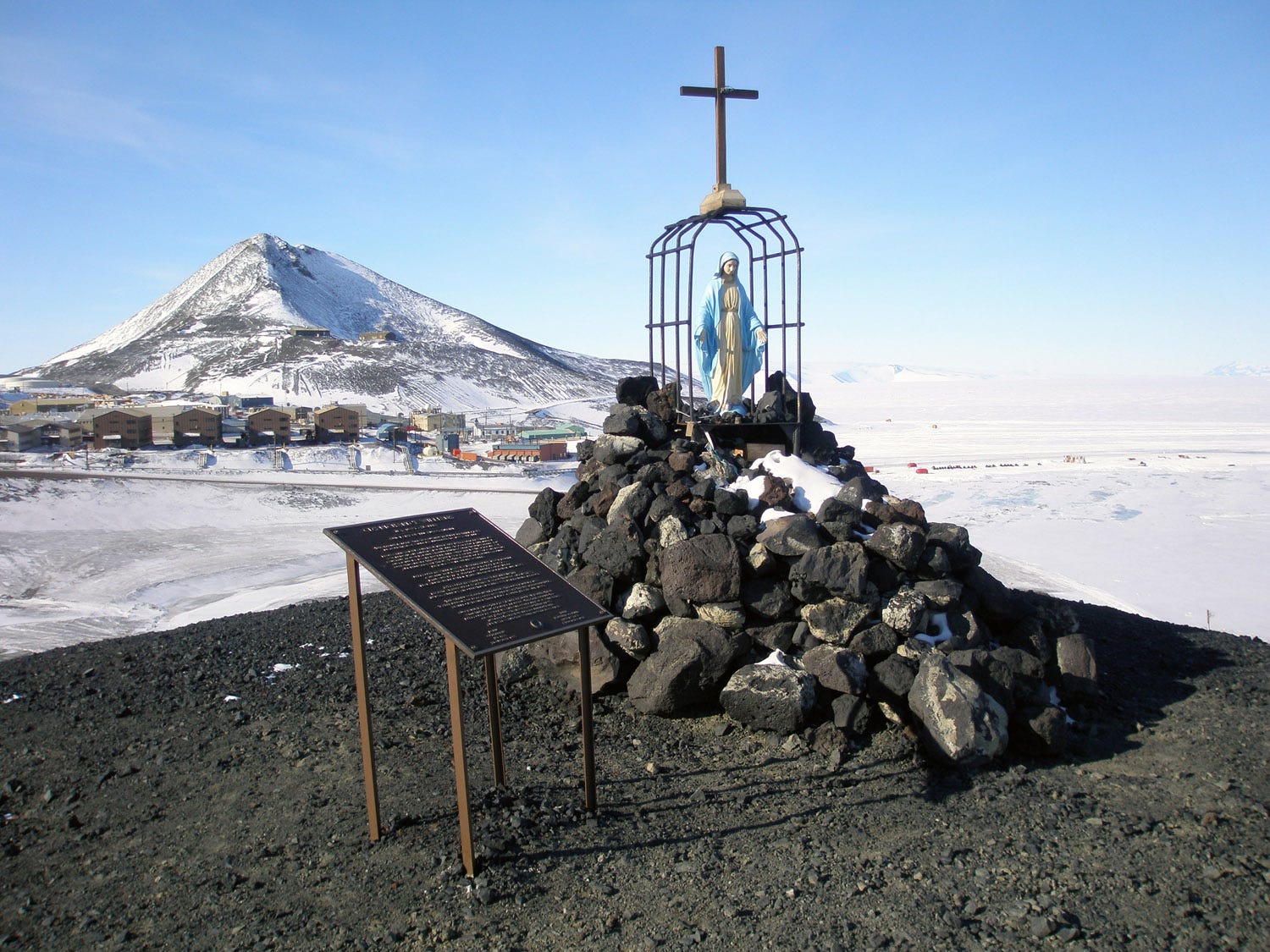 There’s also probably the world’s most southern Marian shrine on top of Observation Hill, overlooking the station, known locally as “Roll Cage Mary,” because the statue of Our Lady is, somewhat, protected by the roll cage of a tractor. It was erected in 1957 in memory of US Petty Officer Richard T. Williams, who died when his tractor fell through the sea ice.