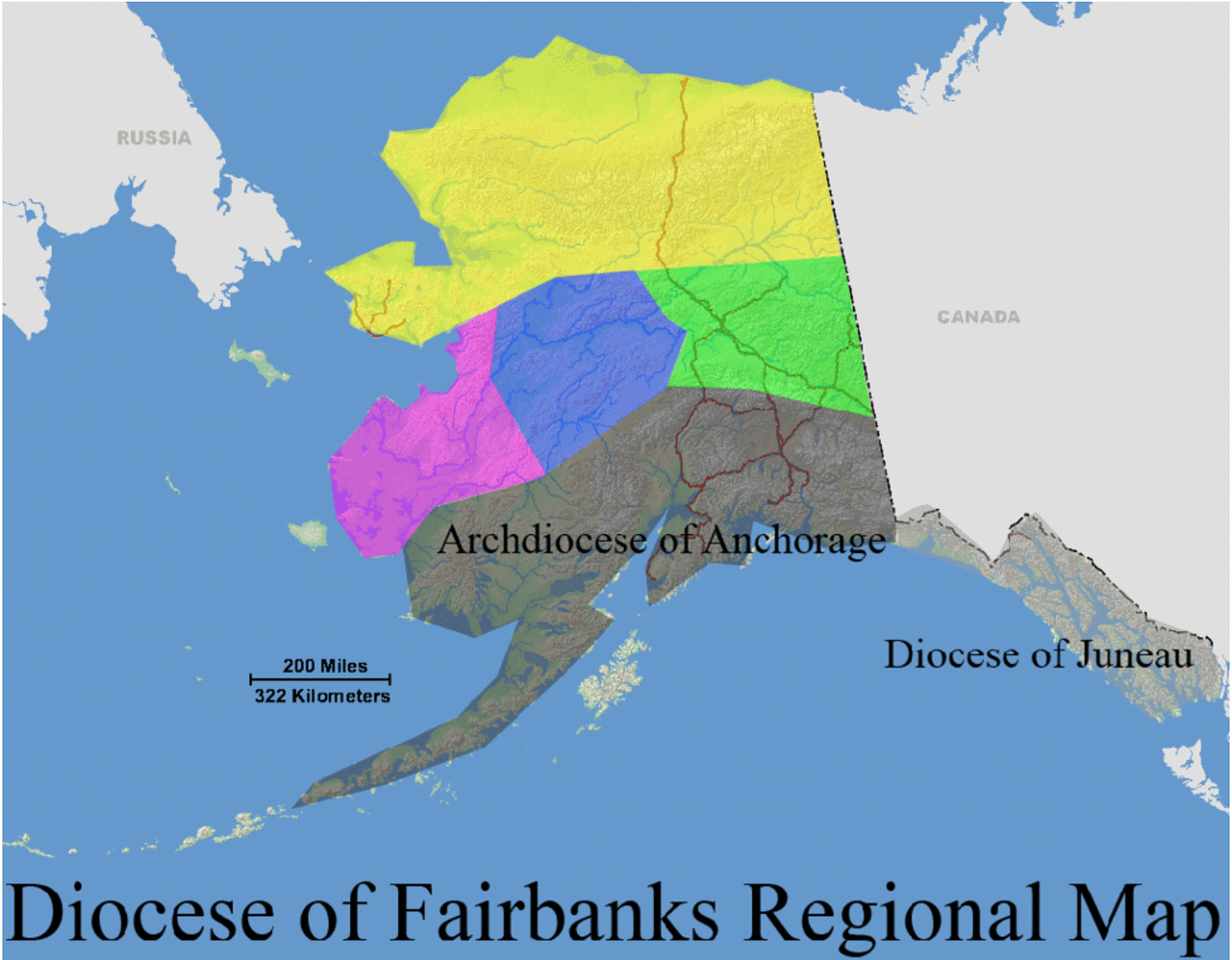 The diocese is separated into four pastoral regions: the Road System (the nine parishes connected by roads), the Yukon-Kuskokwim Delta Region (villages along the Yukon river), the Interior Region, and the Northern Region.