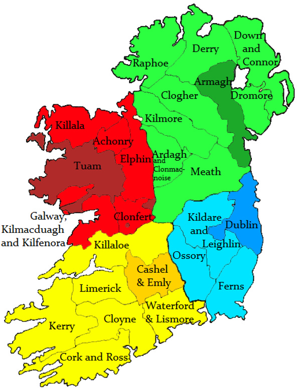 The Catholic Church in Ireland comprises 26 dioceses grouped into four ecclesiastical provinces: Armagh, Dublin, Cashel, and Tuam.