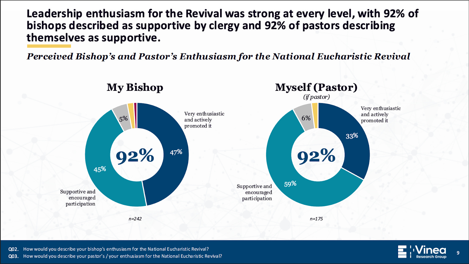 One of the things the Vinea study asked the laity and priests was whether your bishop engaged in the Eucharistic Revival. Ninety-two percent of people said yes, [the bishop was] strongly engaged.