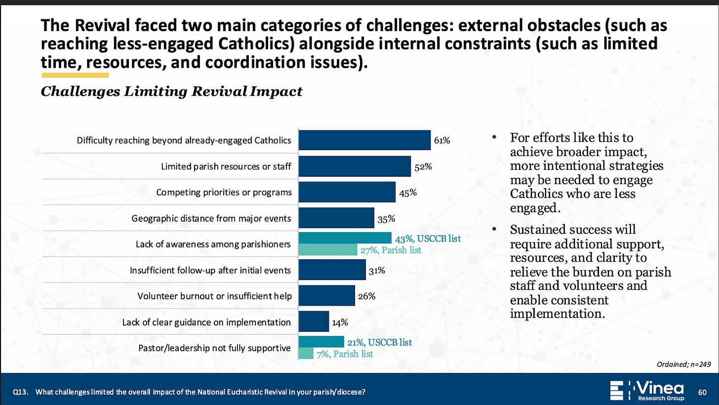 Forty-nine percent of priests surveyed said they were encouraged by the Eucharistic Revival, something like It was just so consoling to me to think that we didn’t set out with this goal to encourage priests, but it did encourage priests and they did experience renewal in their own minis