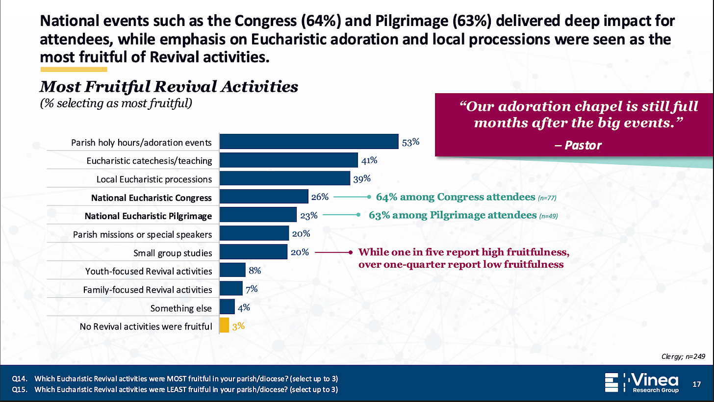 The study noted that the most successful events from the revival were the Congress, pilgrimages and the extra adoration hours in parishes. Formal programs like small groups and speakers were not as effective.