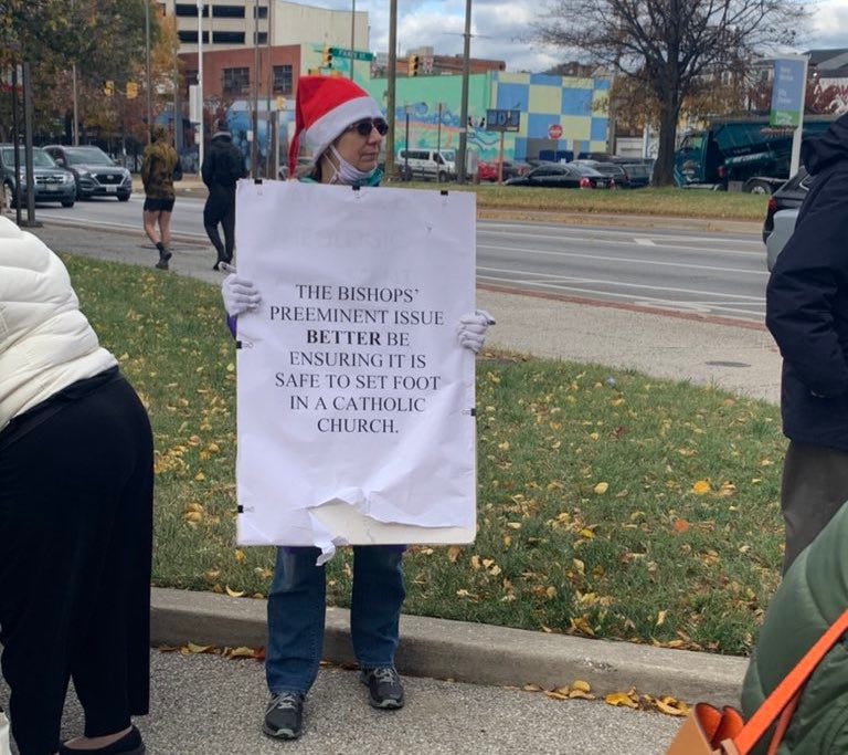 As the U.S. bishops’ conference held regional meetings and a closed-door executive session in a Baltimore hotel Monday afternoon, two groups held demonstrations outside the hotel. One group urged that bishops prohibit pro-choice politicians from receiving Holy Communion, and the other said that no one should be barred from the Eucharist.