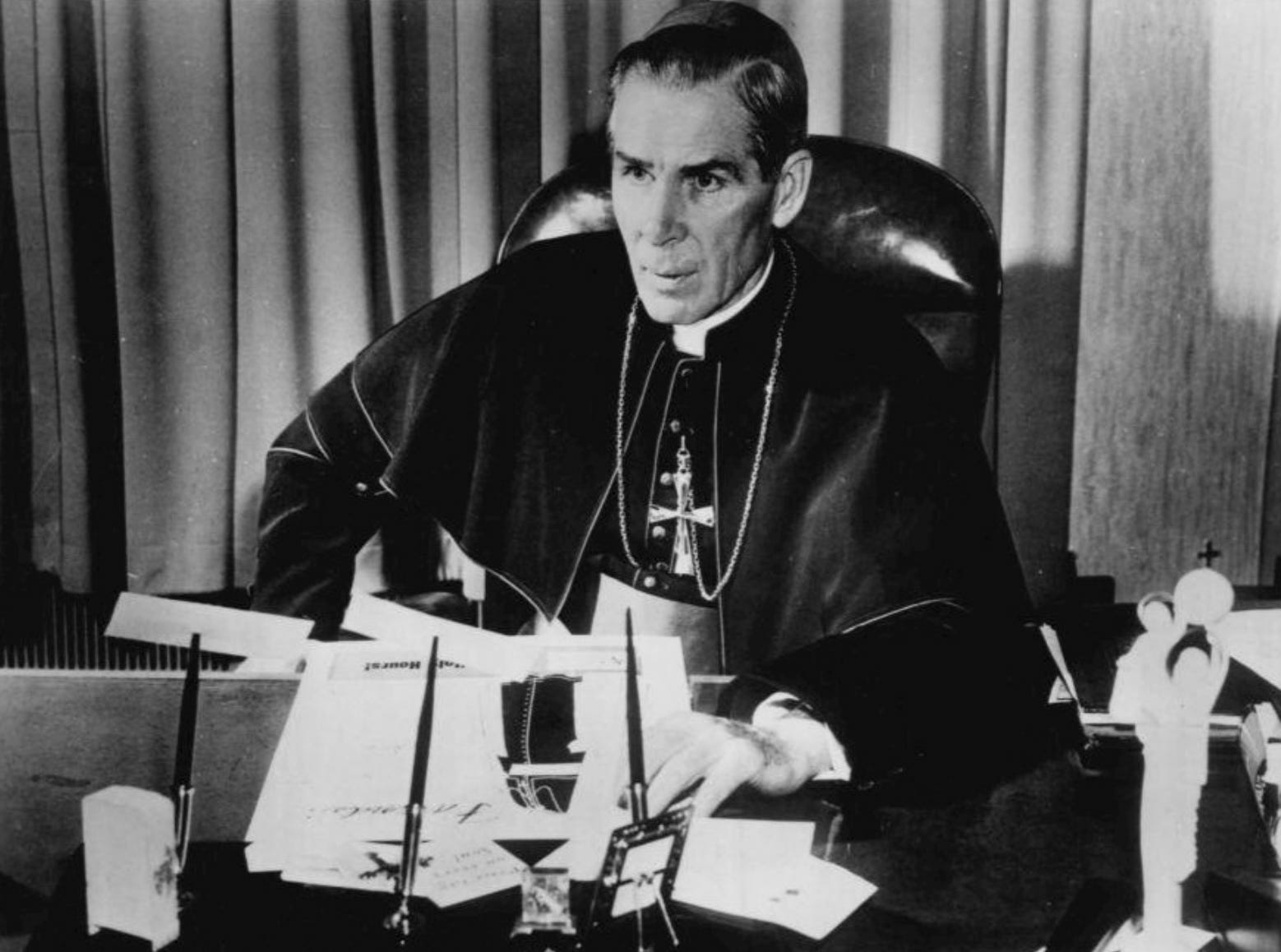 Sheen was ordained a priest in 1919, became a professor at The Catholic University of America, and then a radio host, hosting “The Catholic Hour” on NBC Radio from 1930 until 1950. He was appointed an auxiliary bishop of New York in 1951 and soon after moved into television, hosting “Life is Worth Living” from 1952 until 1957 and “The Fulton Sheen Program” from 1961 until 1968.