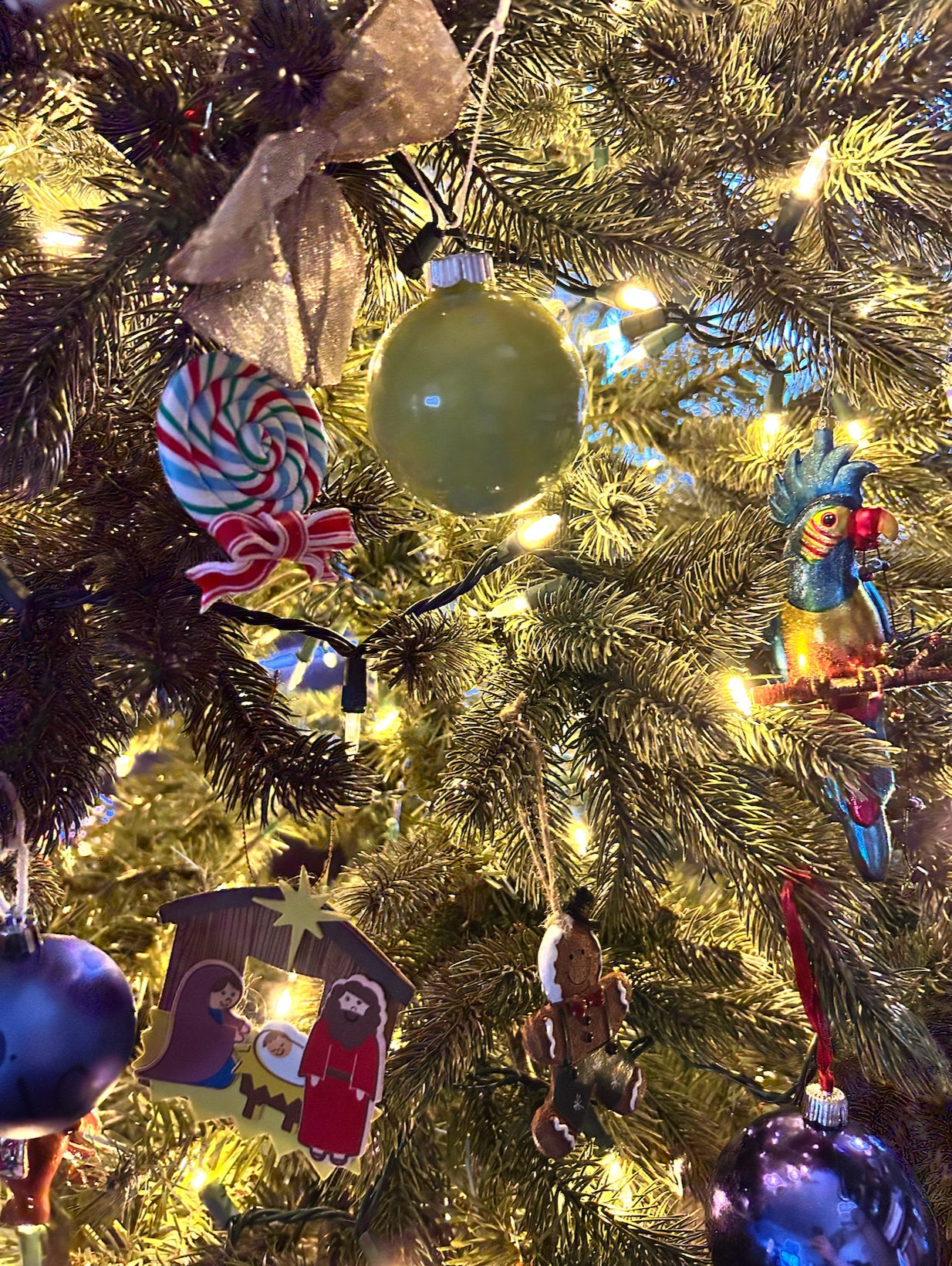 It’s she who decides the general theme and approach of the decor, and she who assigns me to lug certain boxes up from the basement, leaving other Christmas cartons rejected, waiting to be chosen only in some future year.
