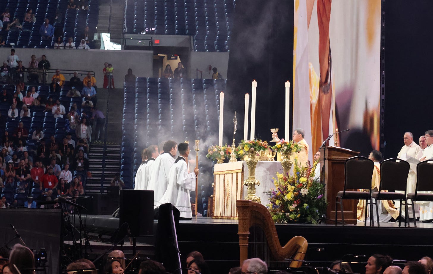 Pilgrims packed Indianapolis’ Lucas Oil Stadium Sunday morning for a Mass that would close the Church’s National Eucharistic Congress — and for a message from a Vatican cardinal that they should see each other as gifts from God, and take up the Gospel’s call to evangelize.